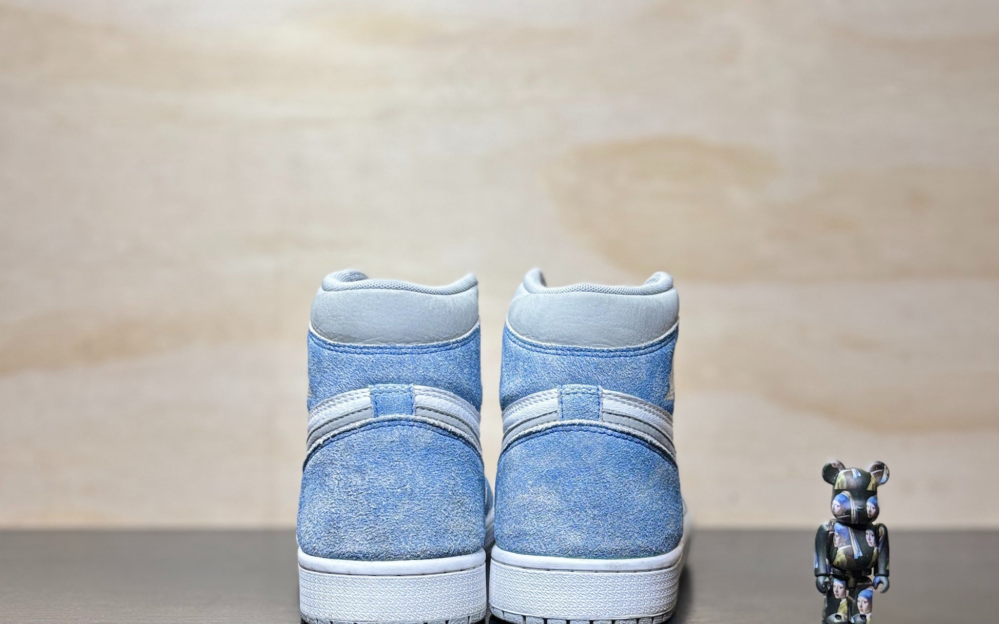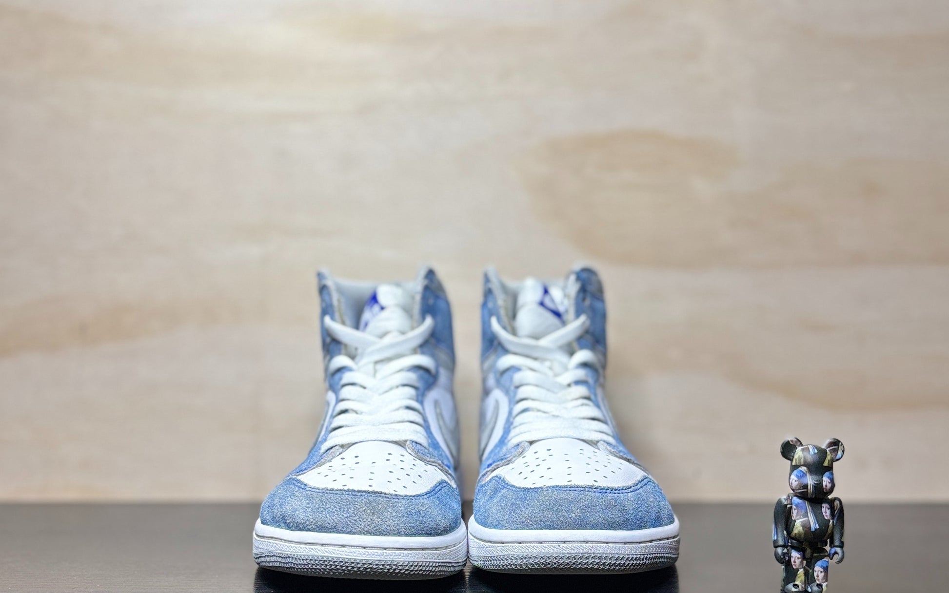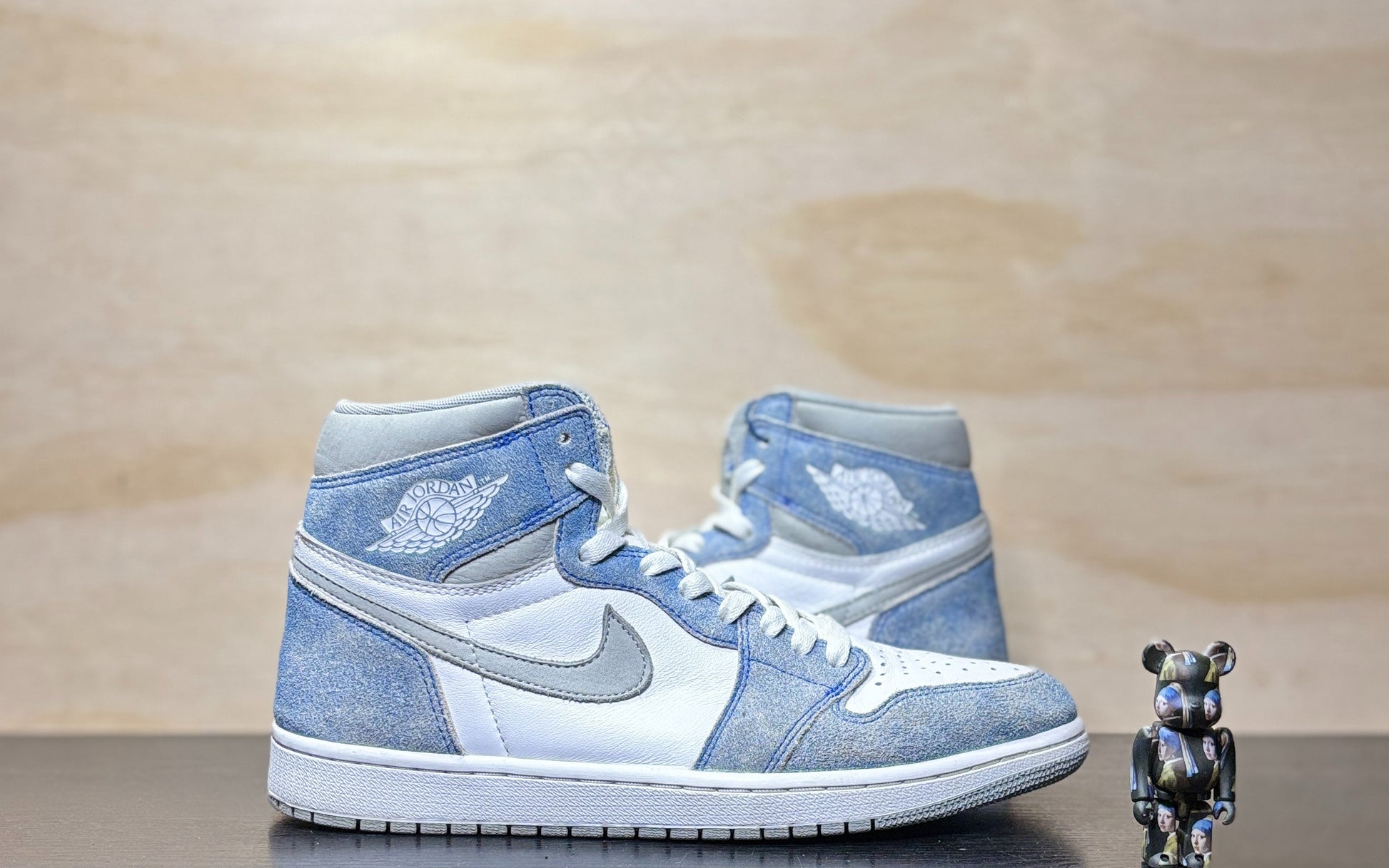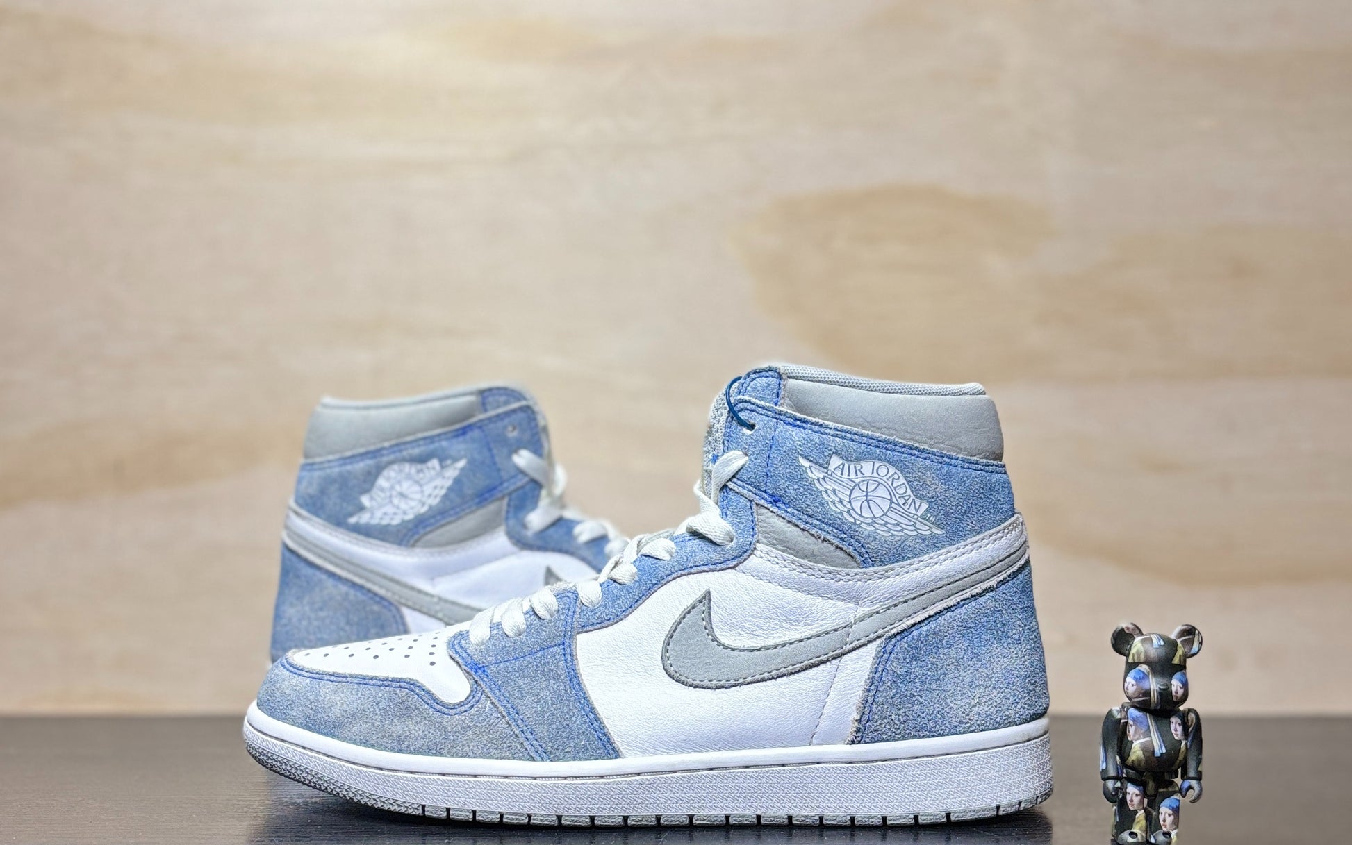 The Air Jordan 1 Retro High OG ‘Hyper Royal’ takes on a weathered aesthetic, highlighted by a white leather upper with faded blue suede overlays. Contrasting neutral grey hits land on the Swoosh and padded collar, adding to the sneaker’s understated palette. OG branding elements include a Jordan Wings logo on the lateral collar flap and a woven Nike tongue tag. The high-top is mounted on a standard AJ1 rubber cupsole, featuring encapsulated Nike Air cushioning in the heel.