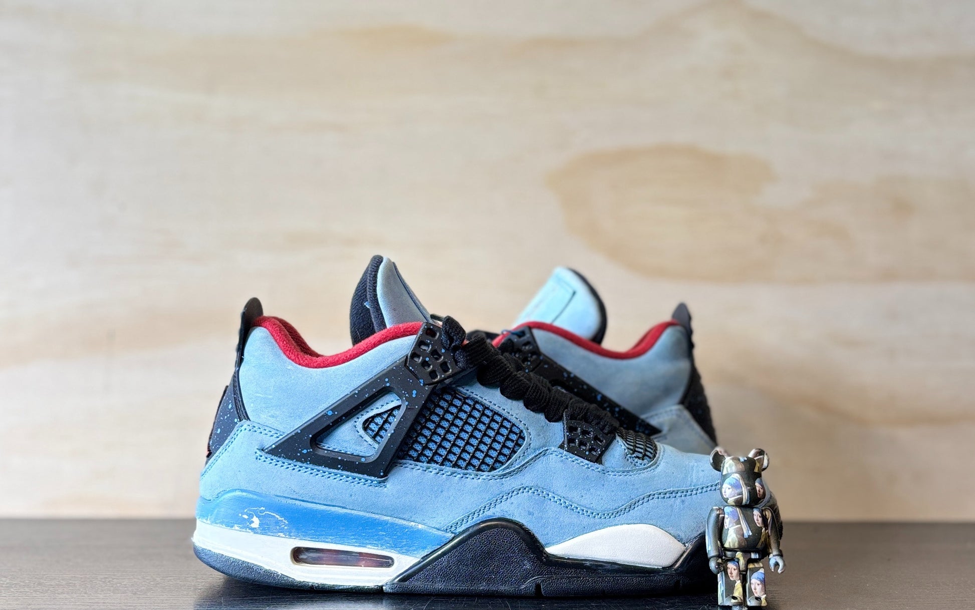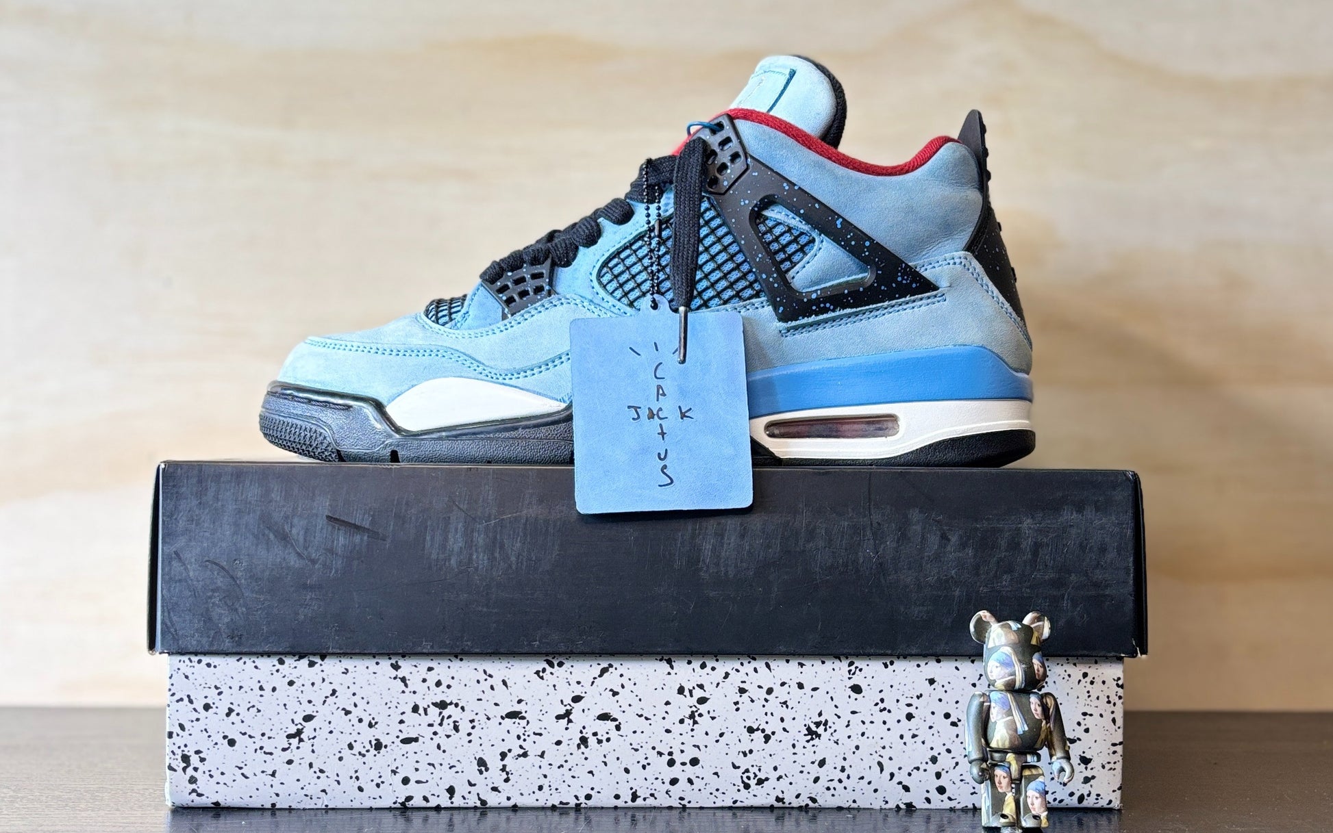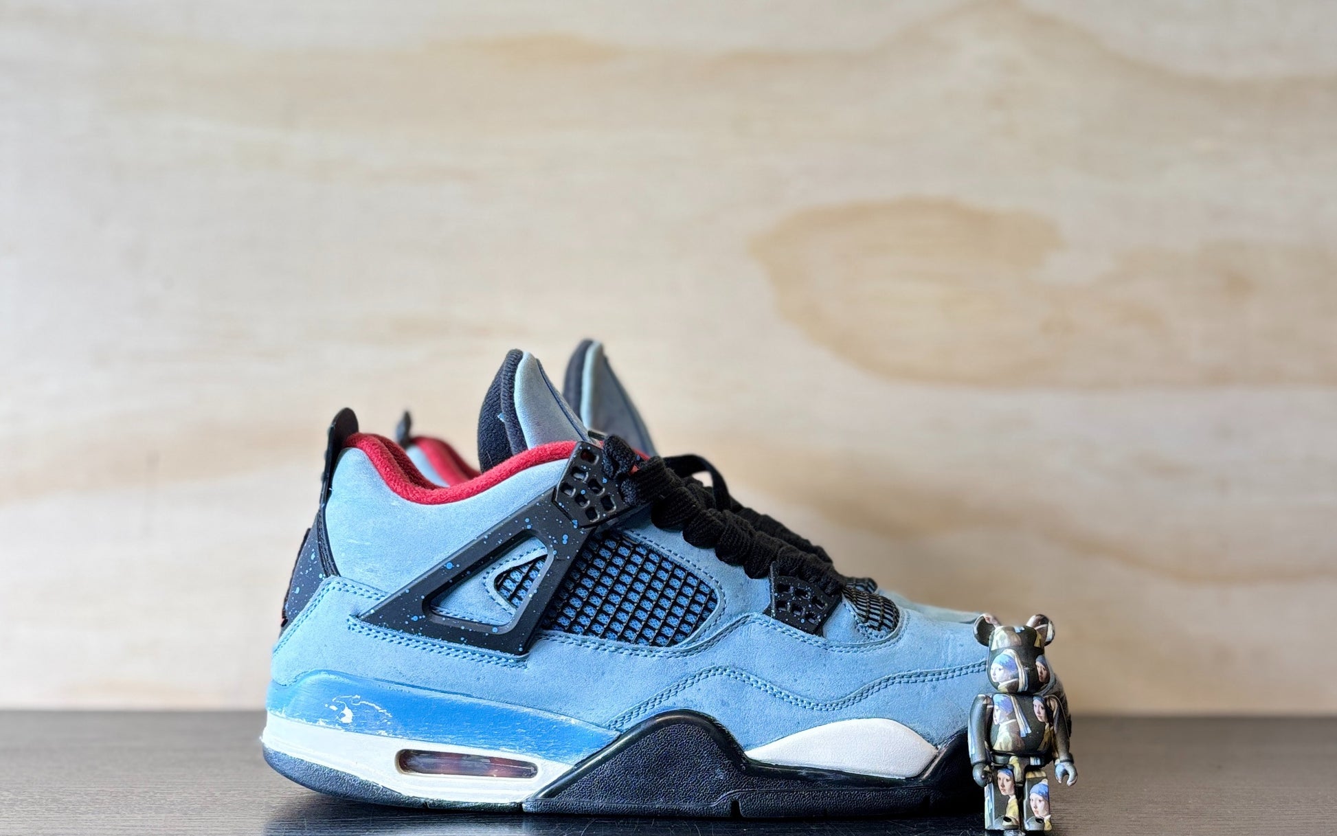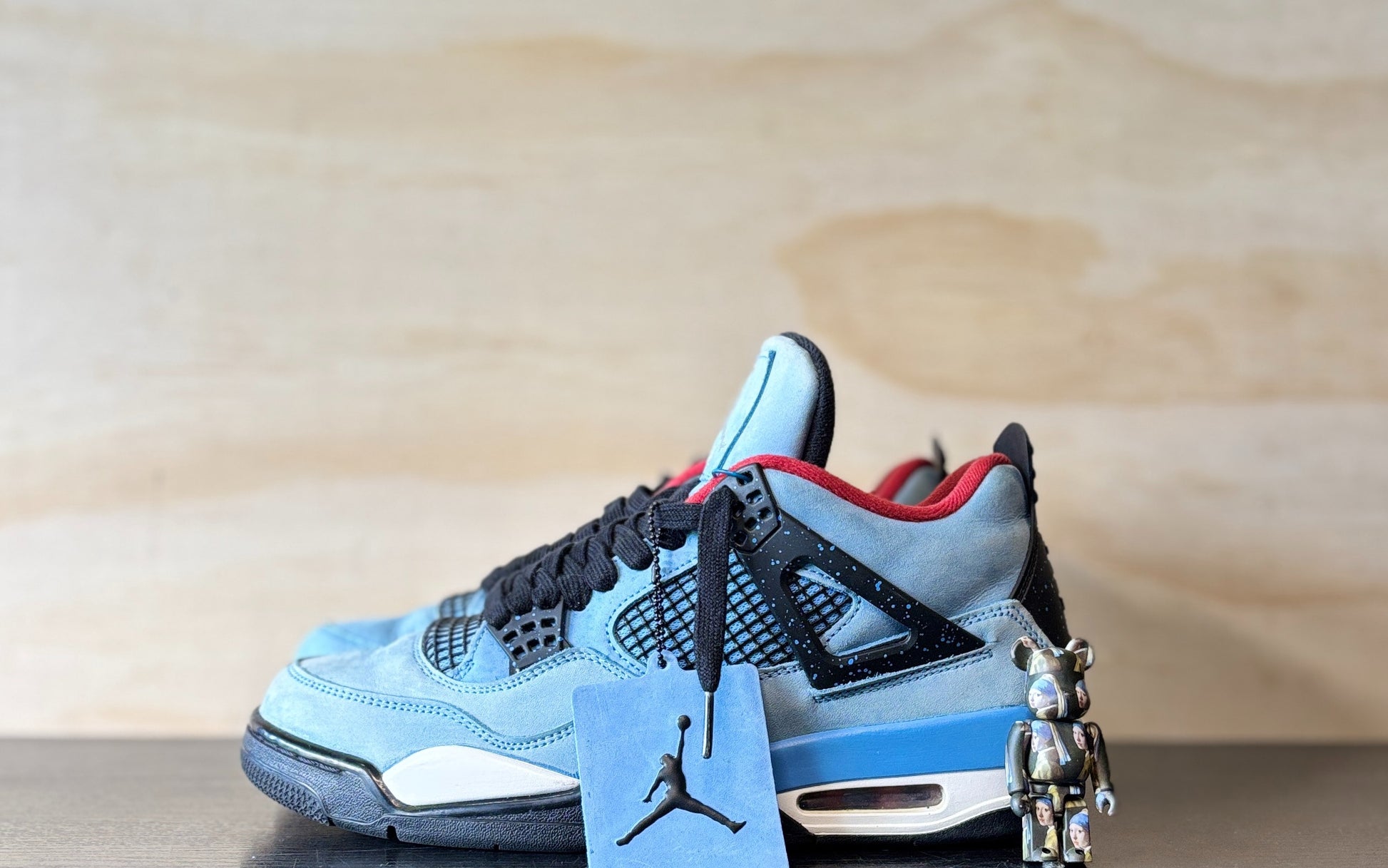 Music artist Travis Scott hails from Houston, where the Oilers used to take the field in red, white and blue uniforms. The Travis Scott x Air Jordan 4 Retro 'Cactus Jack' colorway pays tribute to the city’s bygone football team with a Durabuck leather upper dressed in University Blue and a Varsity Red insole. The black lace cage and a heel panel feature a light blue speckle pattern. Cactus Jack branding appears on the left heel in Varsity Red, with a matching Jumpman logo on the right.