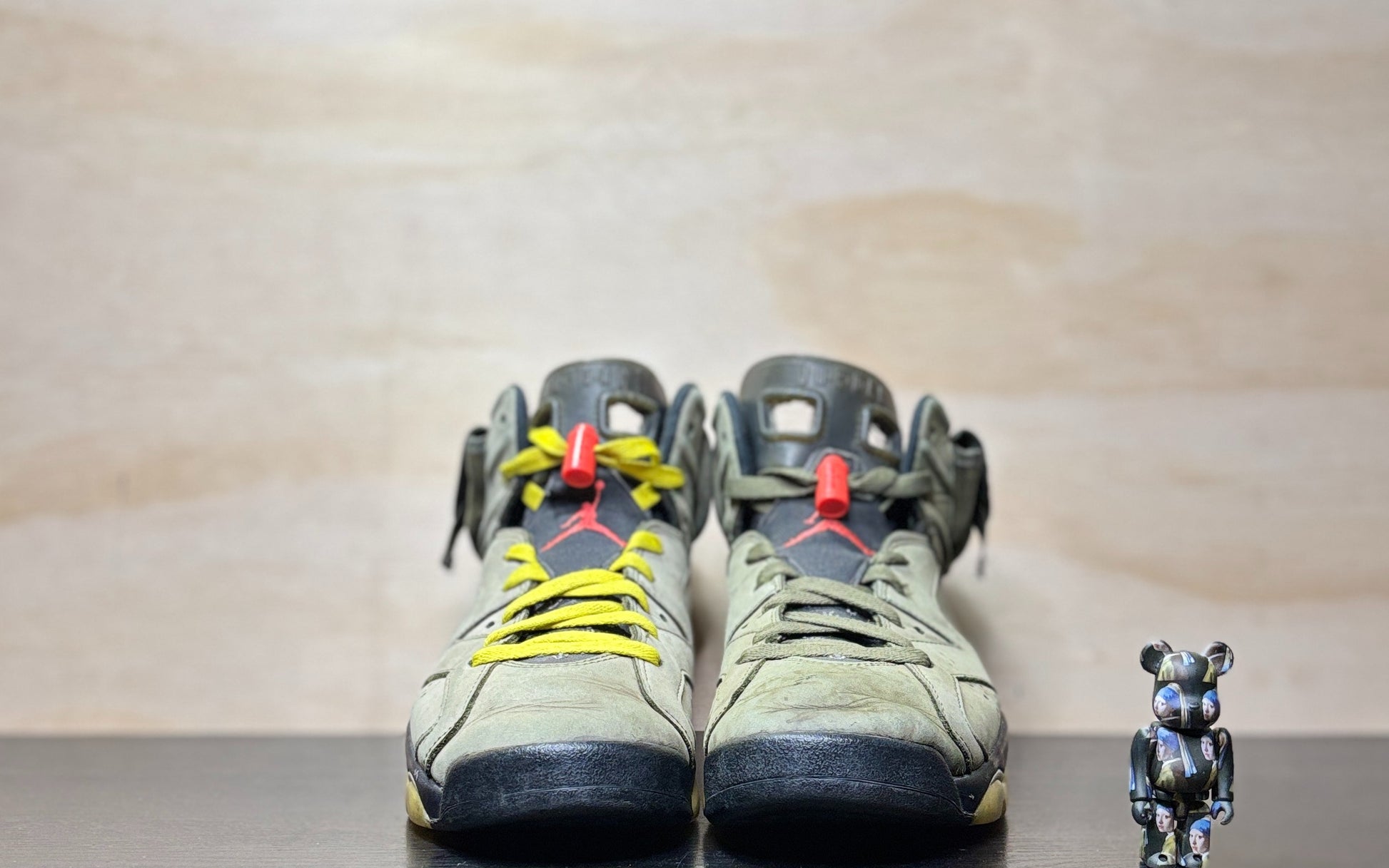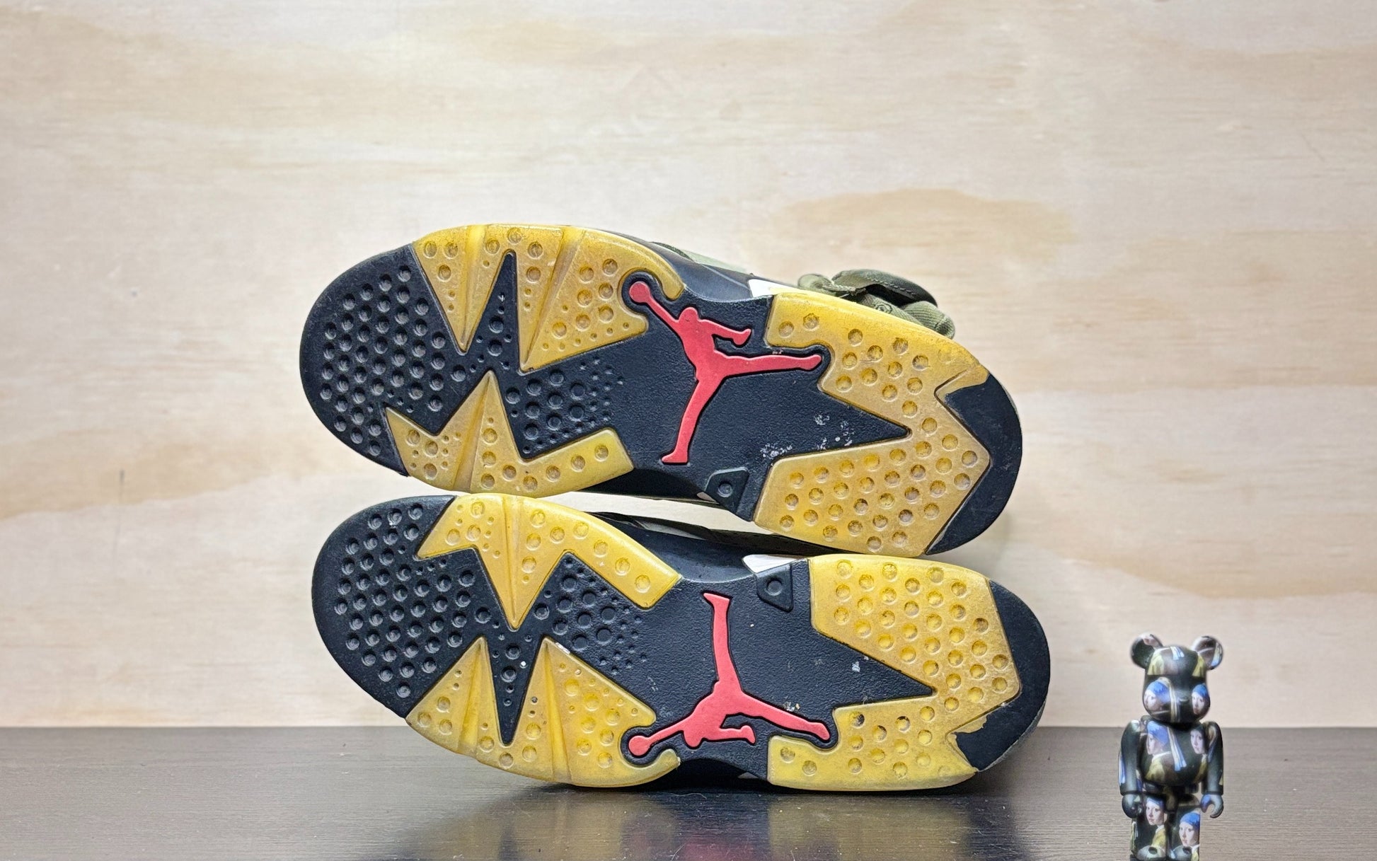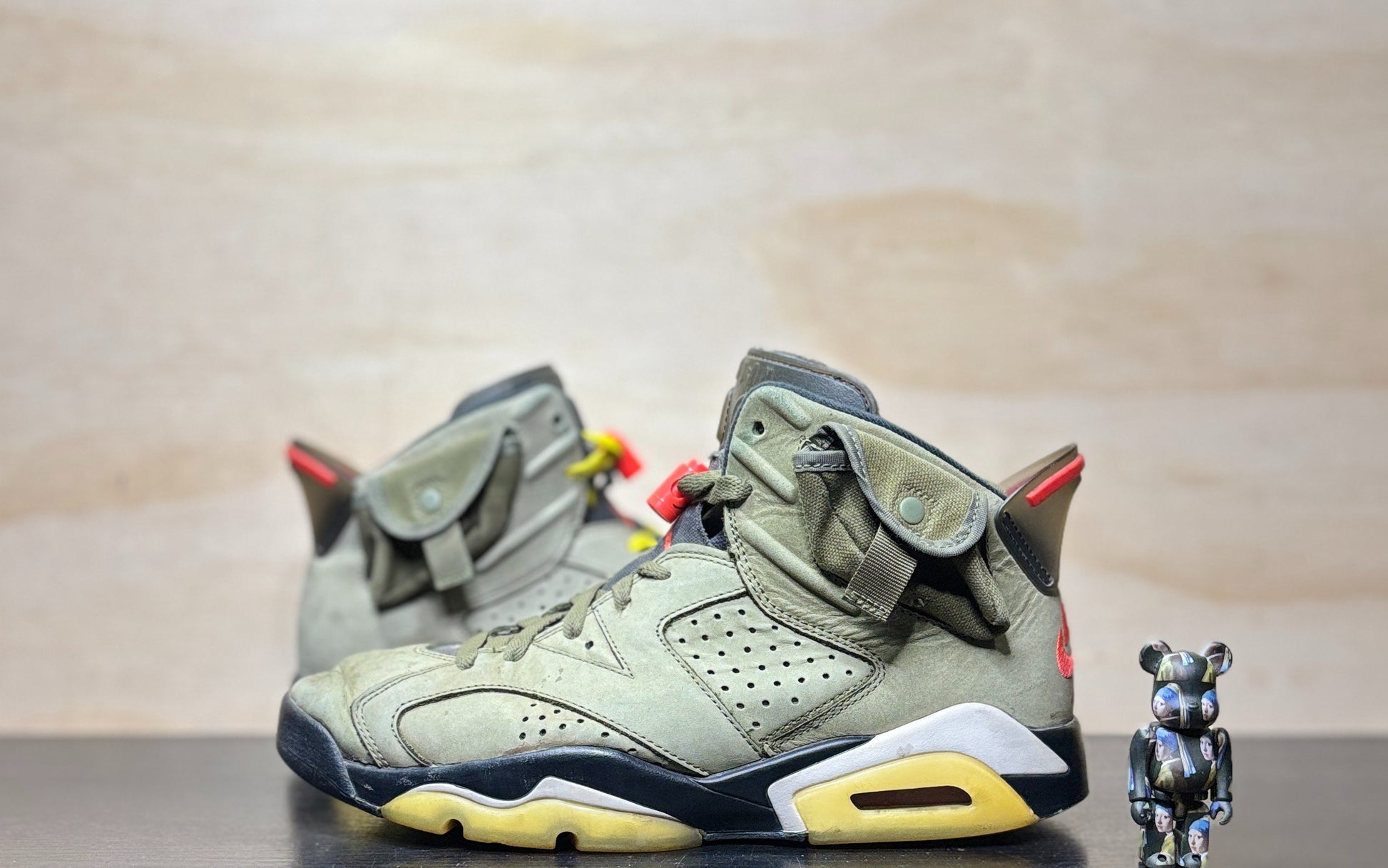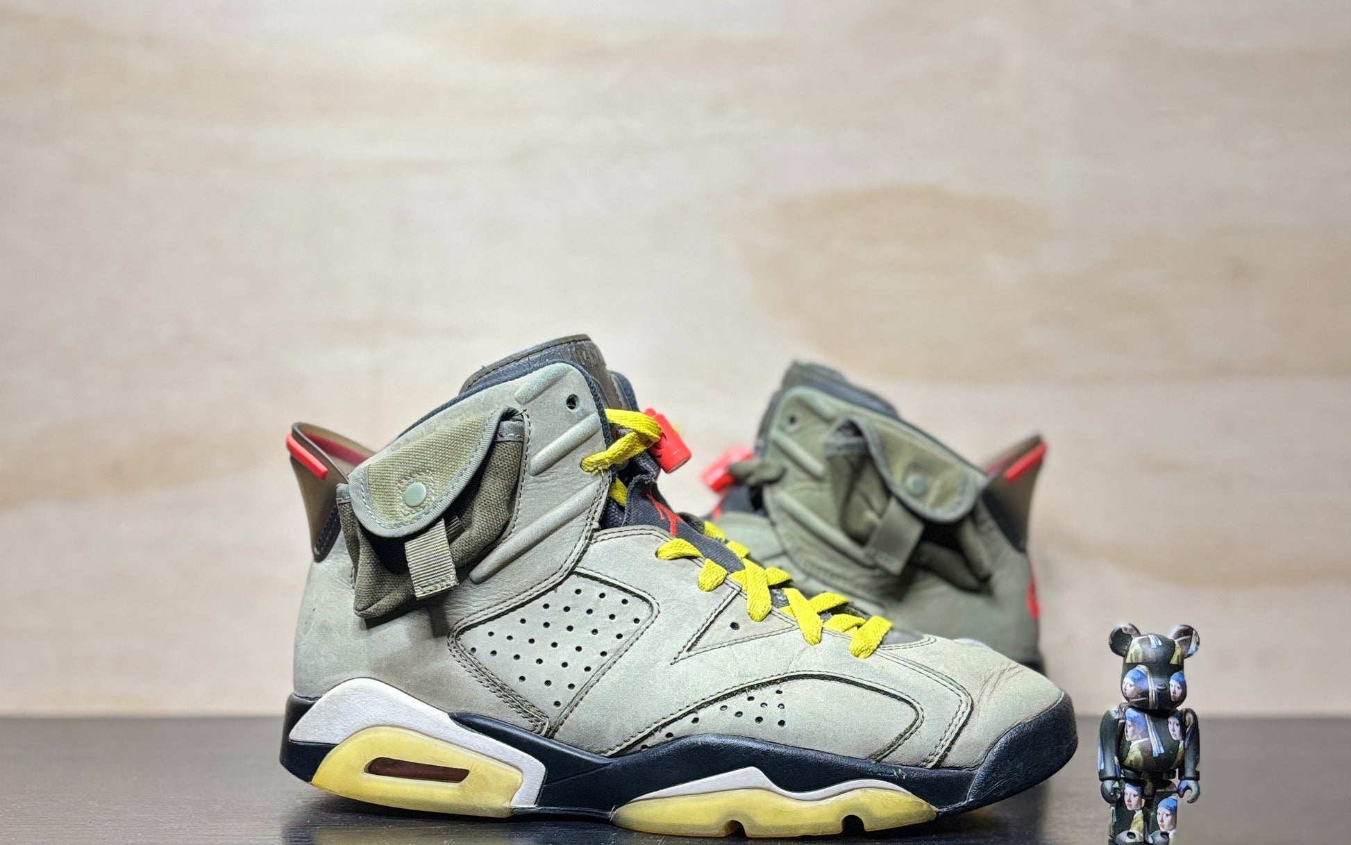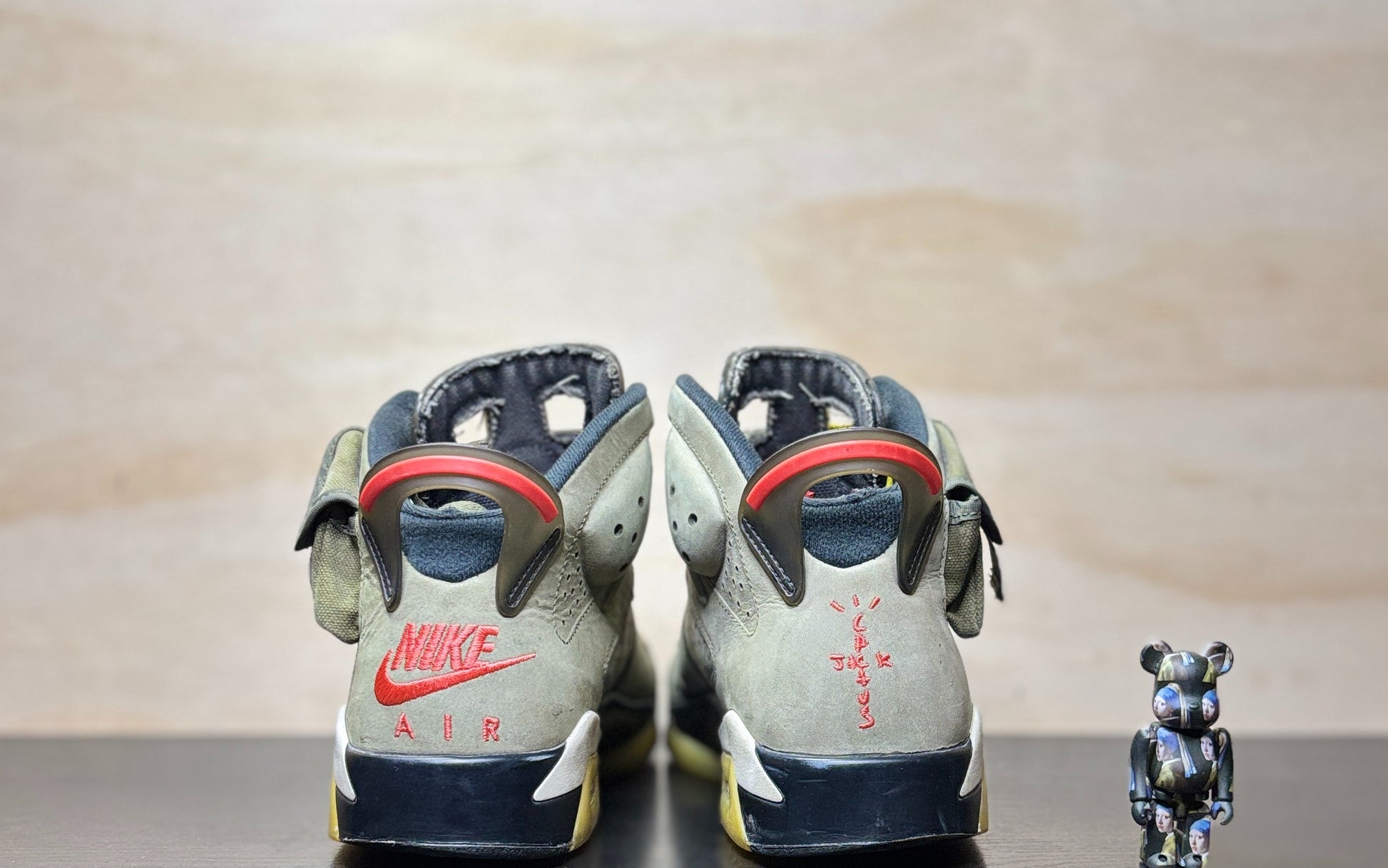 The Travis Scott x Air Jordan 6 Retro 'Olive' represents a collaboration between the Houston based rapper and Jordan Brand. This take on the AJ 6, which Scott debuted while performing during halftime of Super Bowl 53, released in October 2019. It features a Medium Olive, black, Sail and University Red colorway along with several unique elements: a small pocket with a snap on the collar, a nubuck and suede upper, Scott's 'Cactus Jack' logo on the heel and a glow-in-the-dark translucent outsole.