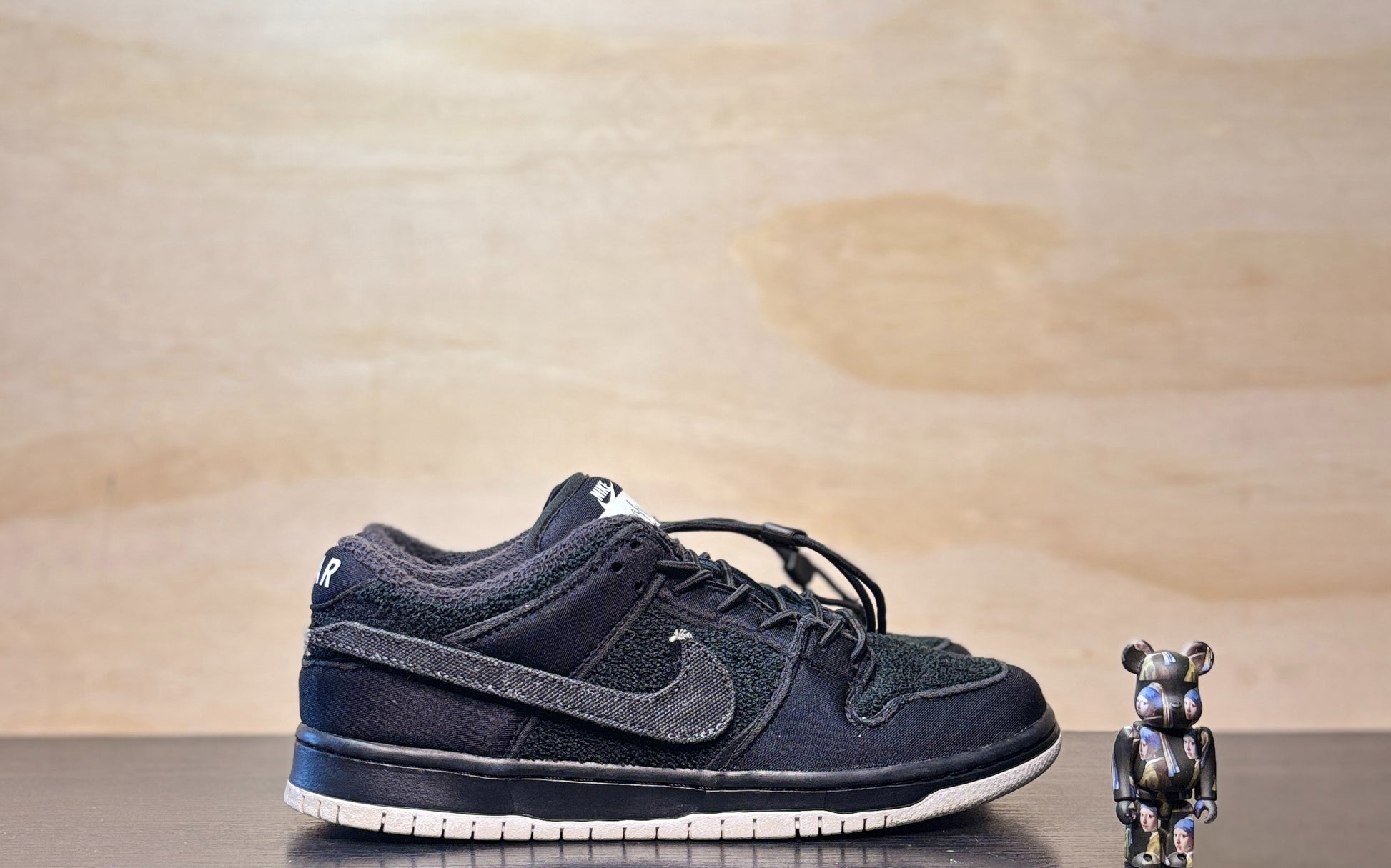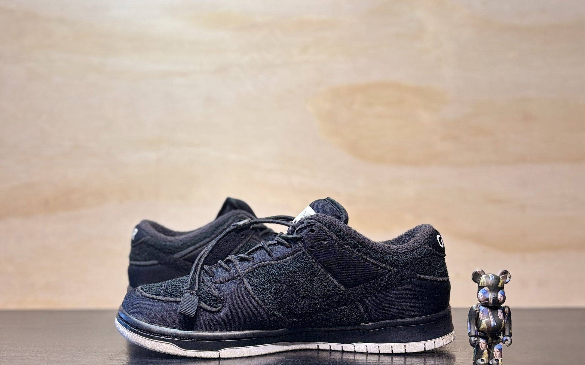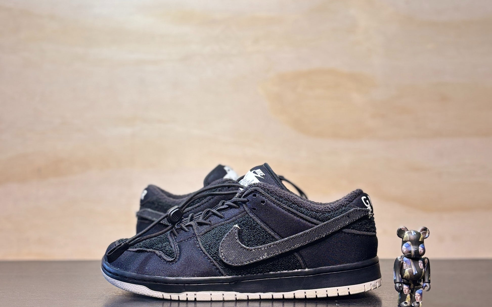 The Gnarhunters x Nike Dunk Low SB ‘Black’ represents the follow-up effort to the San Francisco-based skate and surf brand’s Blazer SB collaboration from 2019. Secured with bungee-cord laces and a convenient toggle, the blacked-out upper features beachfront materials, highlighted by a towel-inspired terry cloth base with textile twill overlays. Gnarhunters branding appears on the tongue and heel tab, while a removable Velcro Swoosh adorns the side panel. Underfoot, a solid white rubber outsole provides superior board feel.