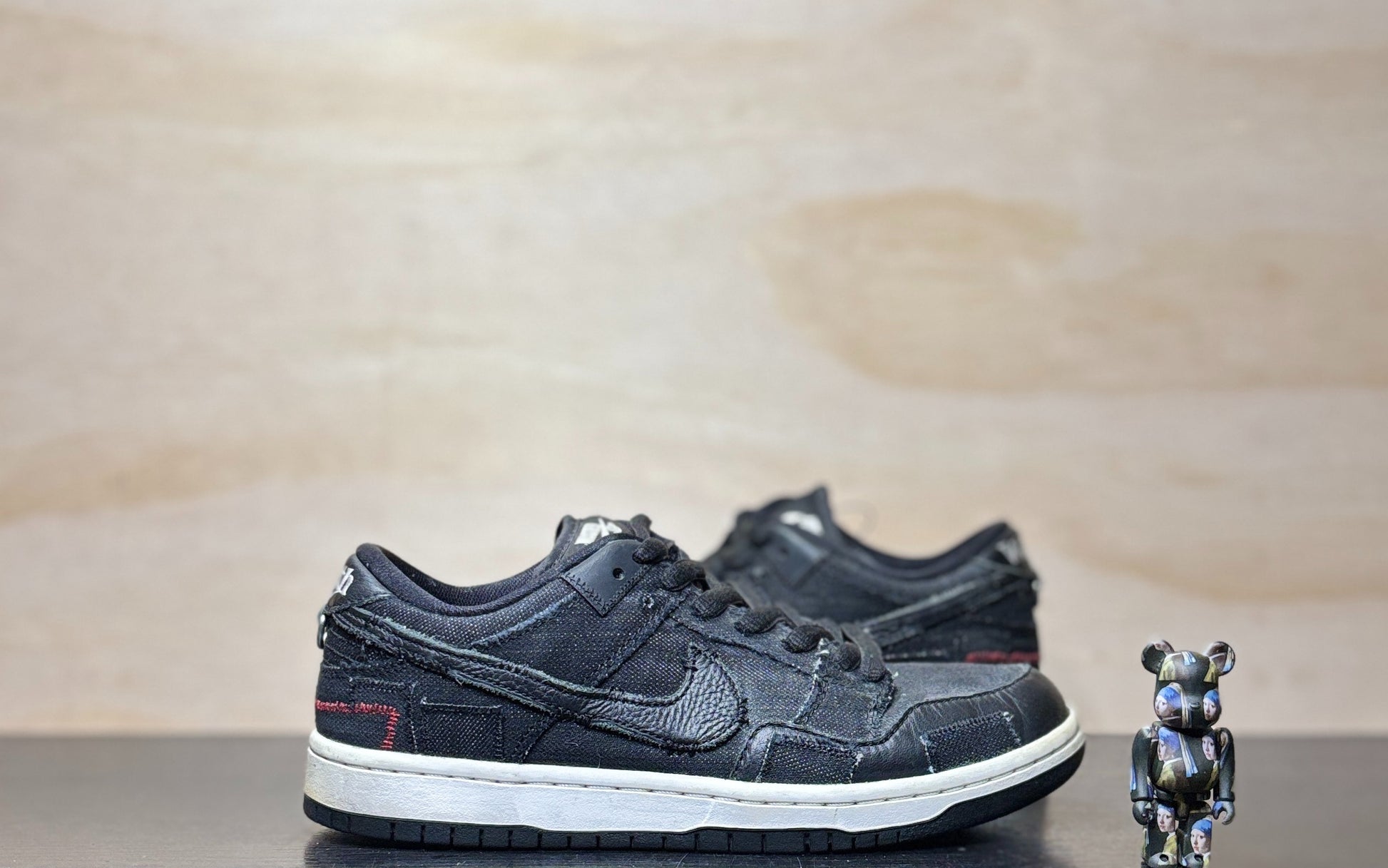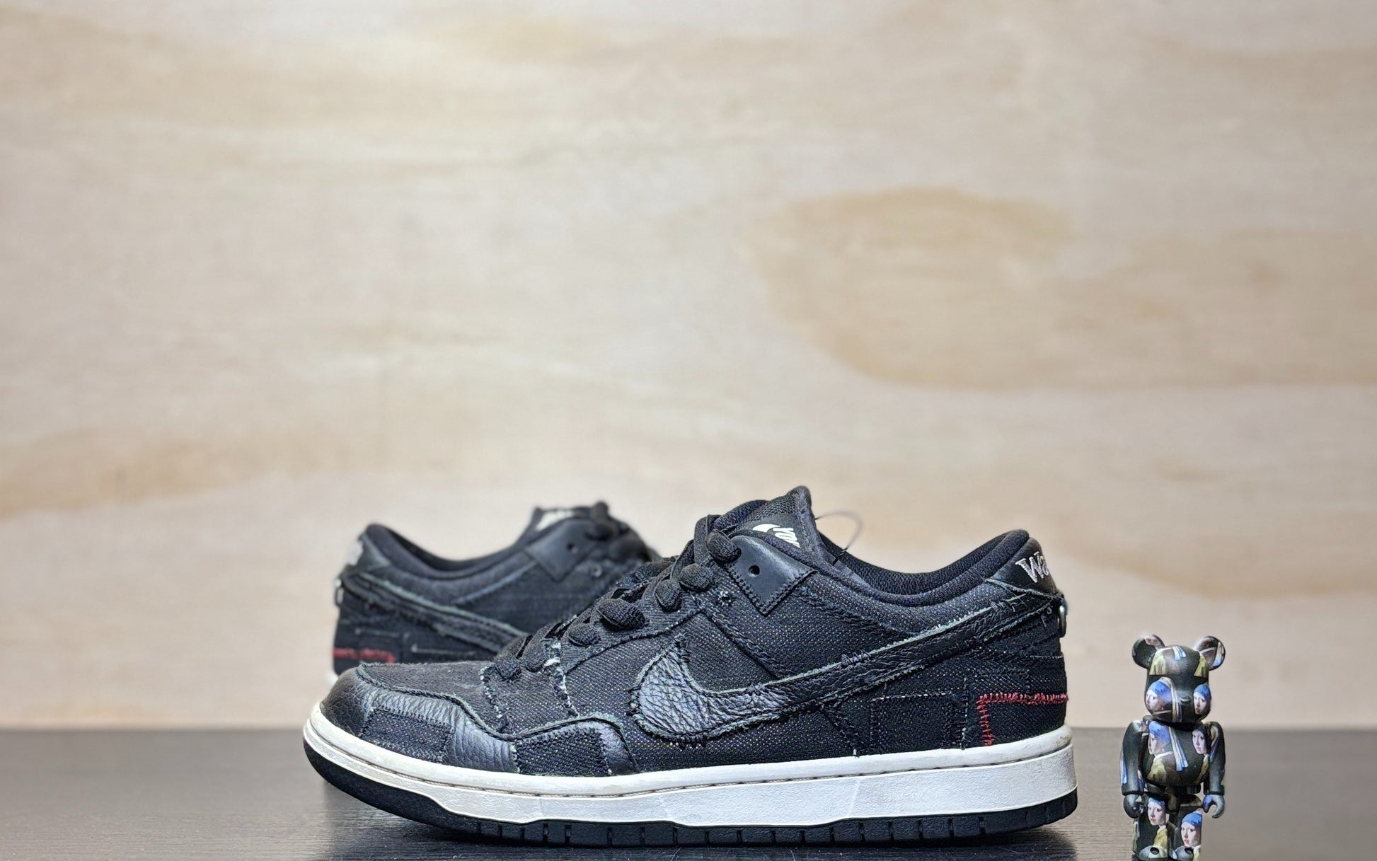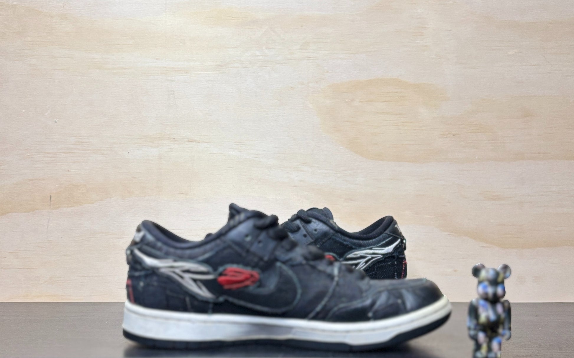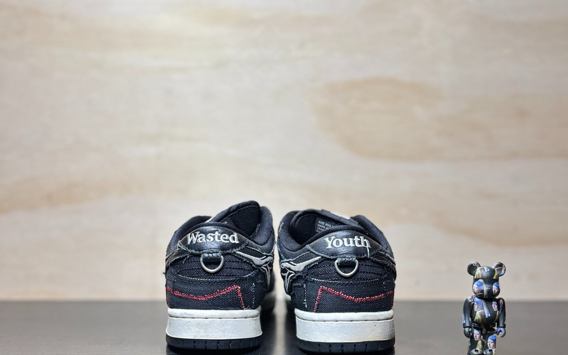 Created in partnership with the Japanese streetwear label founded by the graphic designer simply known as Verdy, the Wasted Youth x Nike Dunk Low SB 'Black Denim' updates the retro low-top with a punk-rock aesthetic. Exposed stitching and a patchwork-like design enhances the DIY look of the upper, constructed from black denim with a tonal forefoot leather overlay. An embroidered red rose graphic is integrated into the medial Swoosh, while the heel tab is garlanded with metal hardware and inscribed with ‘Wasted Youth’ across both shoes. Custom sockliners announce ‘No Thank You I Don’t Need Your Support’ and ‘Don’t Bother Me Anymore.’