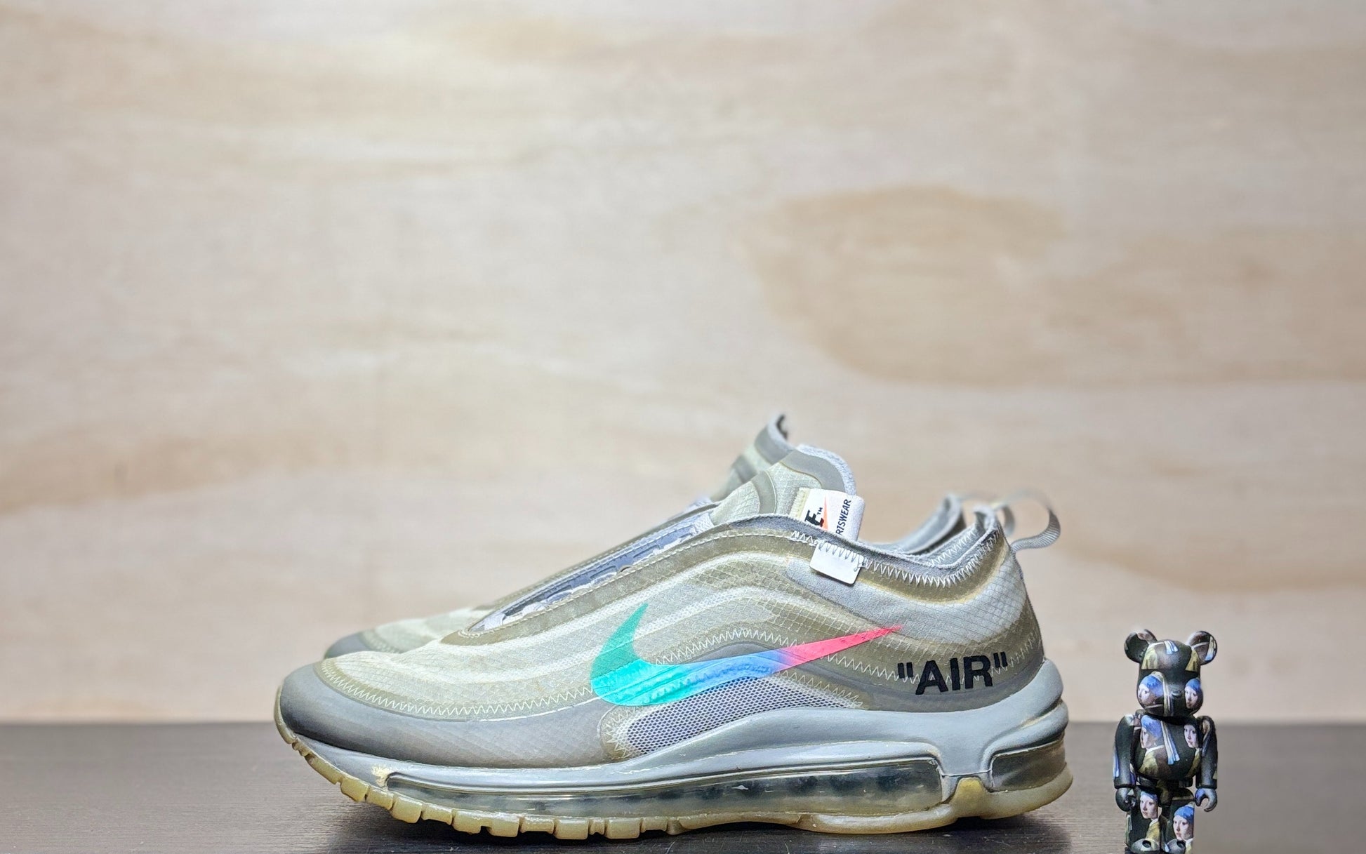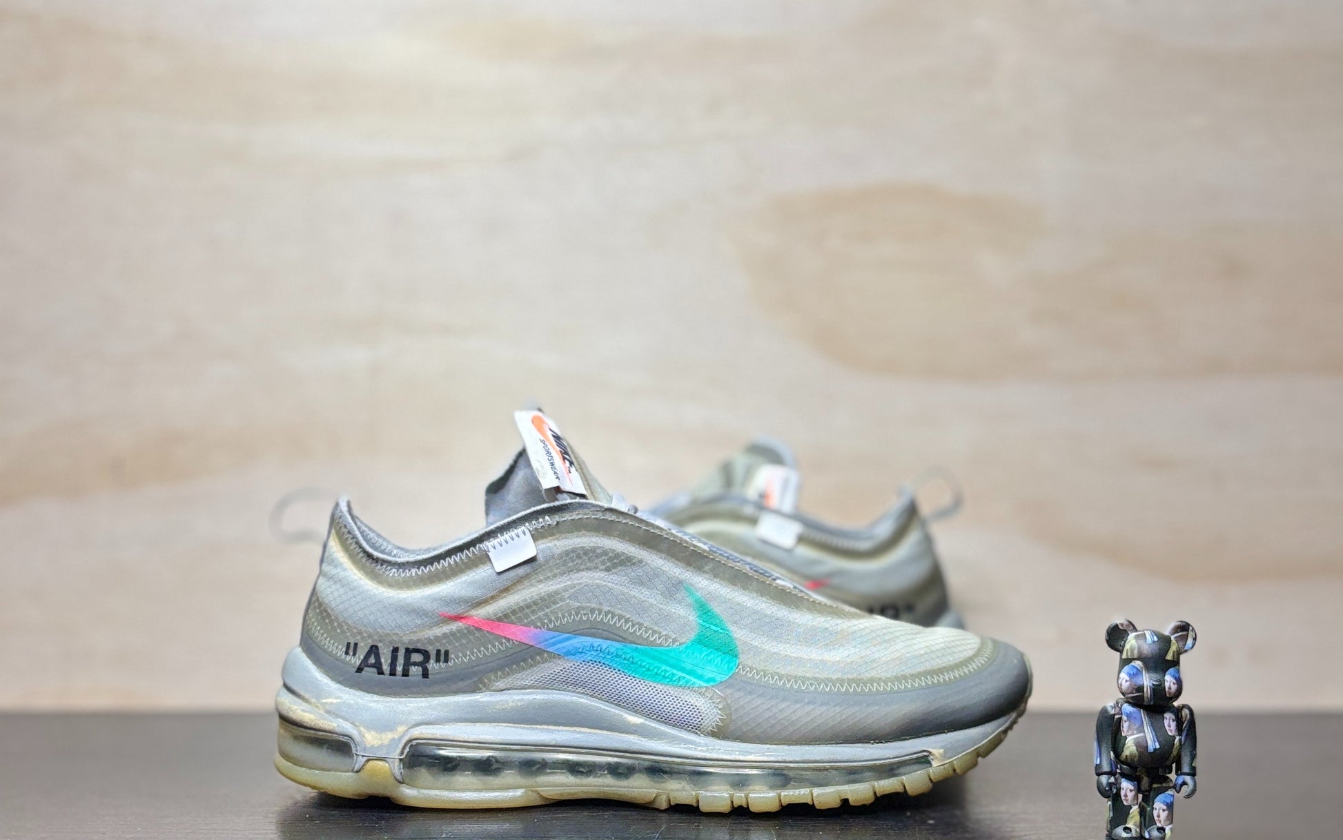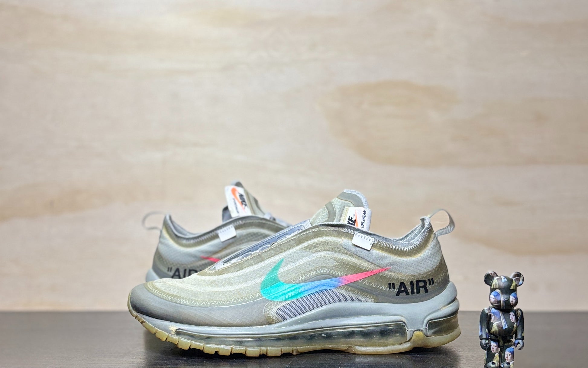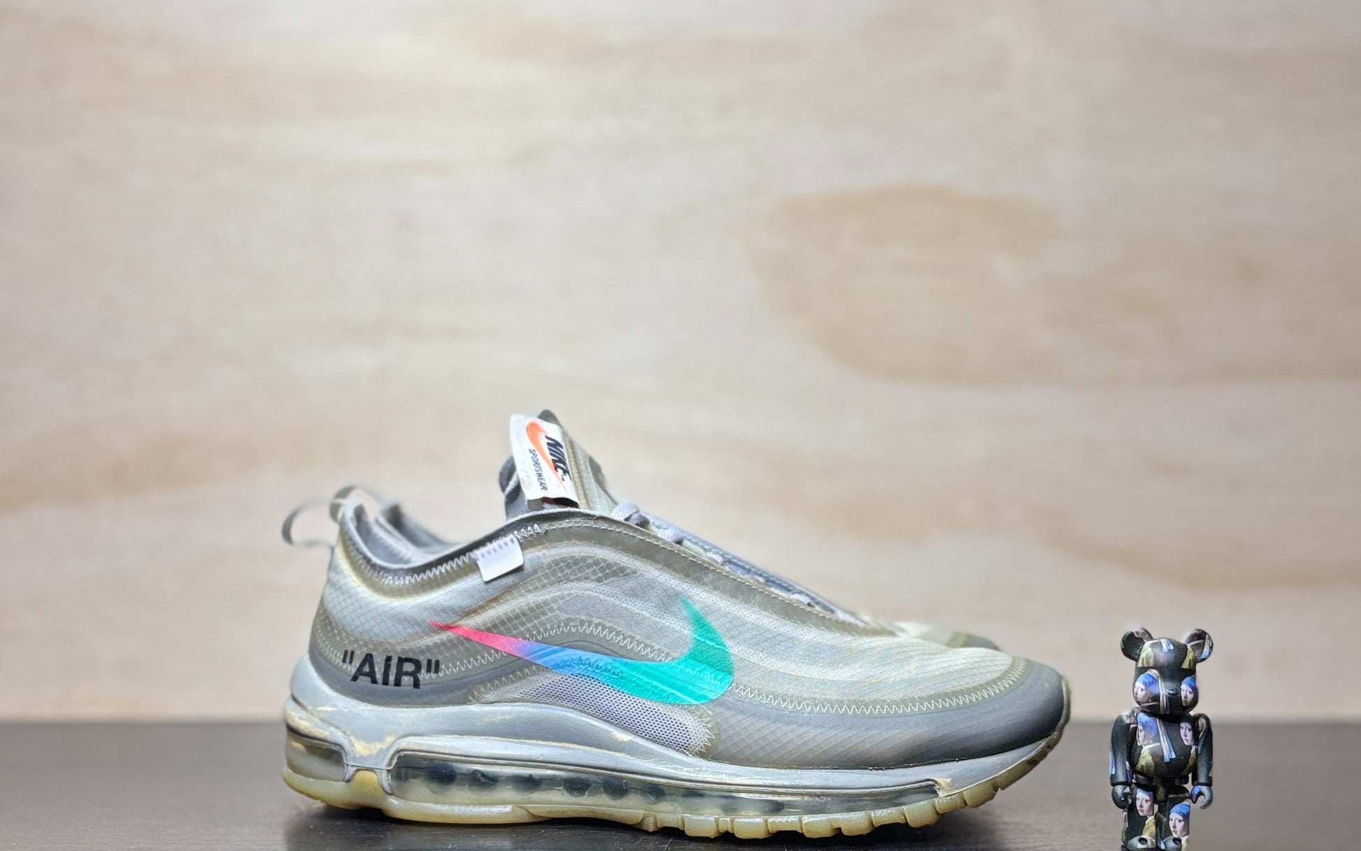 The Off-White x Air Max 97 ‘Menta’ features a translucent textile upper finished in Wolf Grey, complemented by Virgil Abloh’s signature text and tonal zigzag stitching throughout. The neutral color scheme is disrupted by a multicolored Swoosh that transitions from green to blue to red, while underfoot, a smoky grey rubber outsole maintains the shoe’s translucent theme.