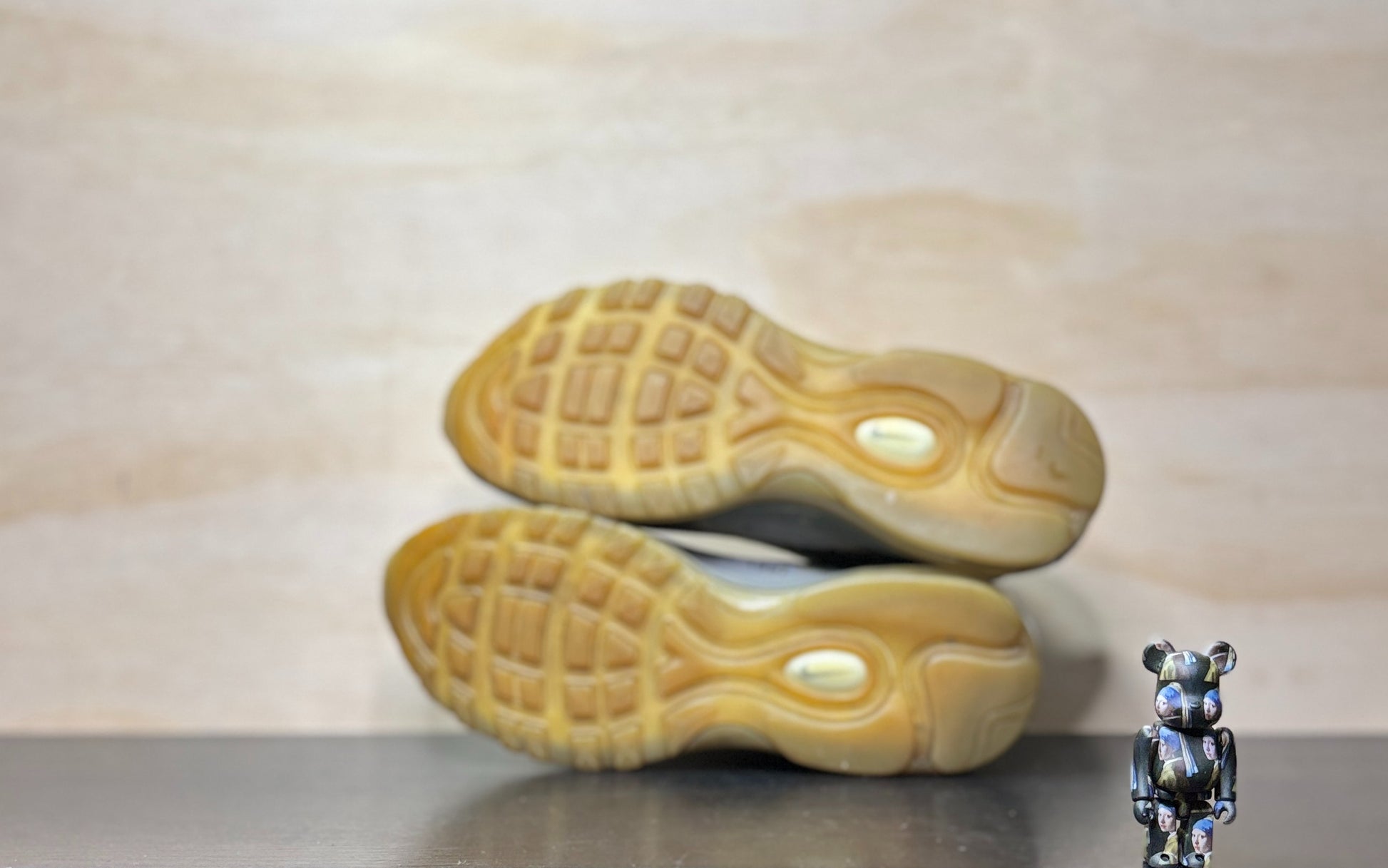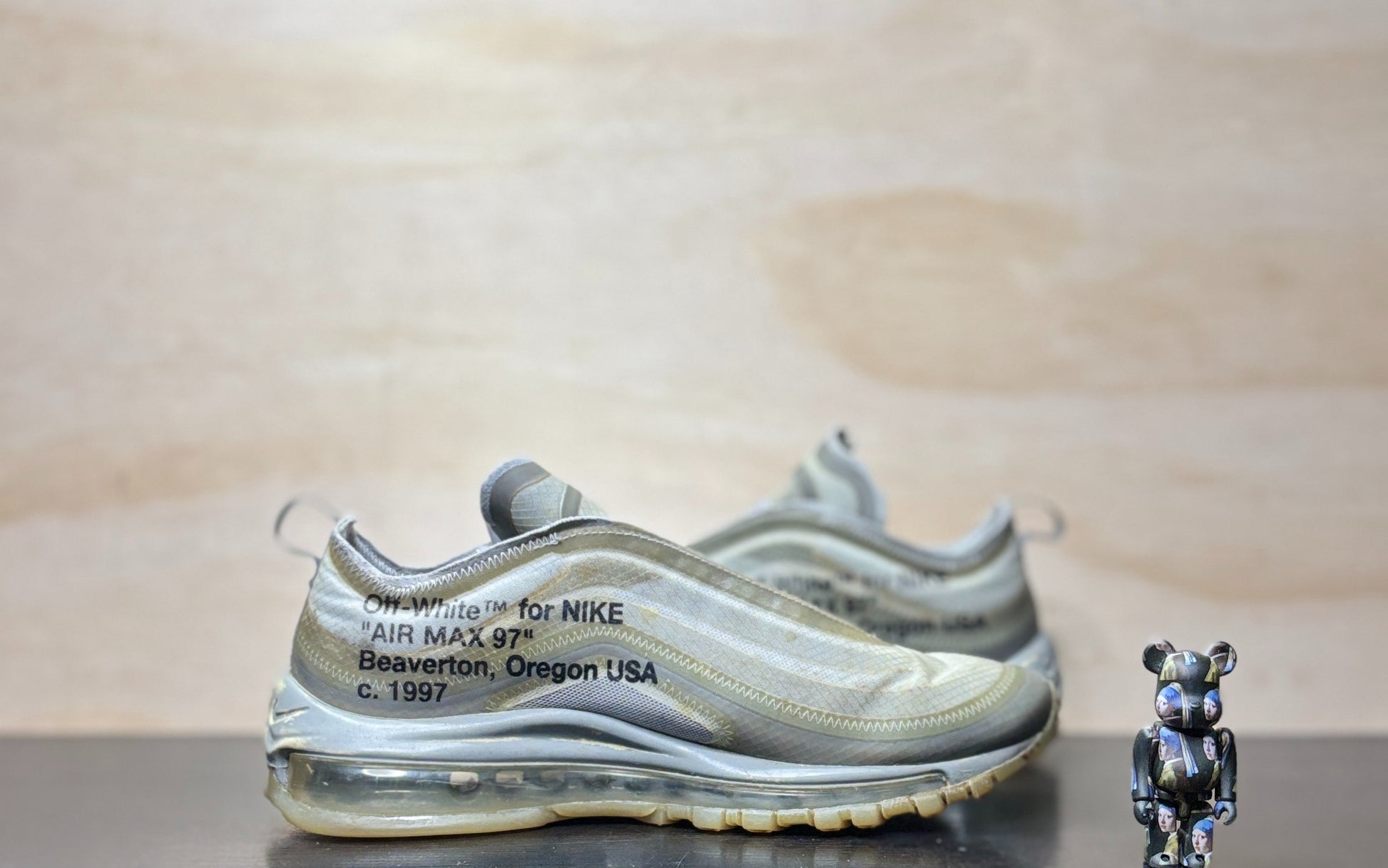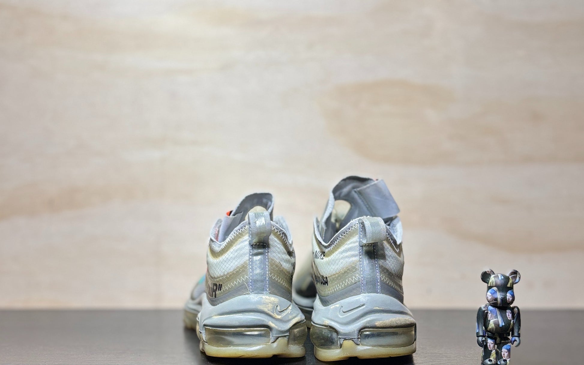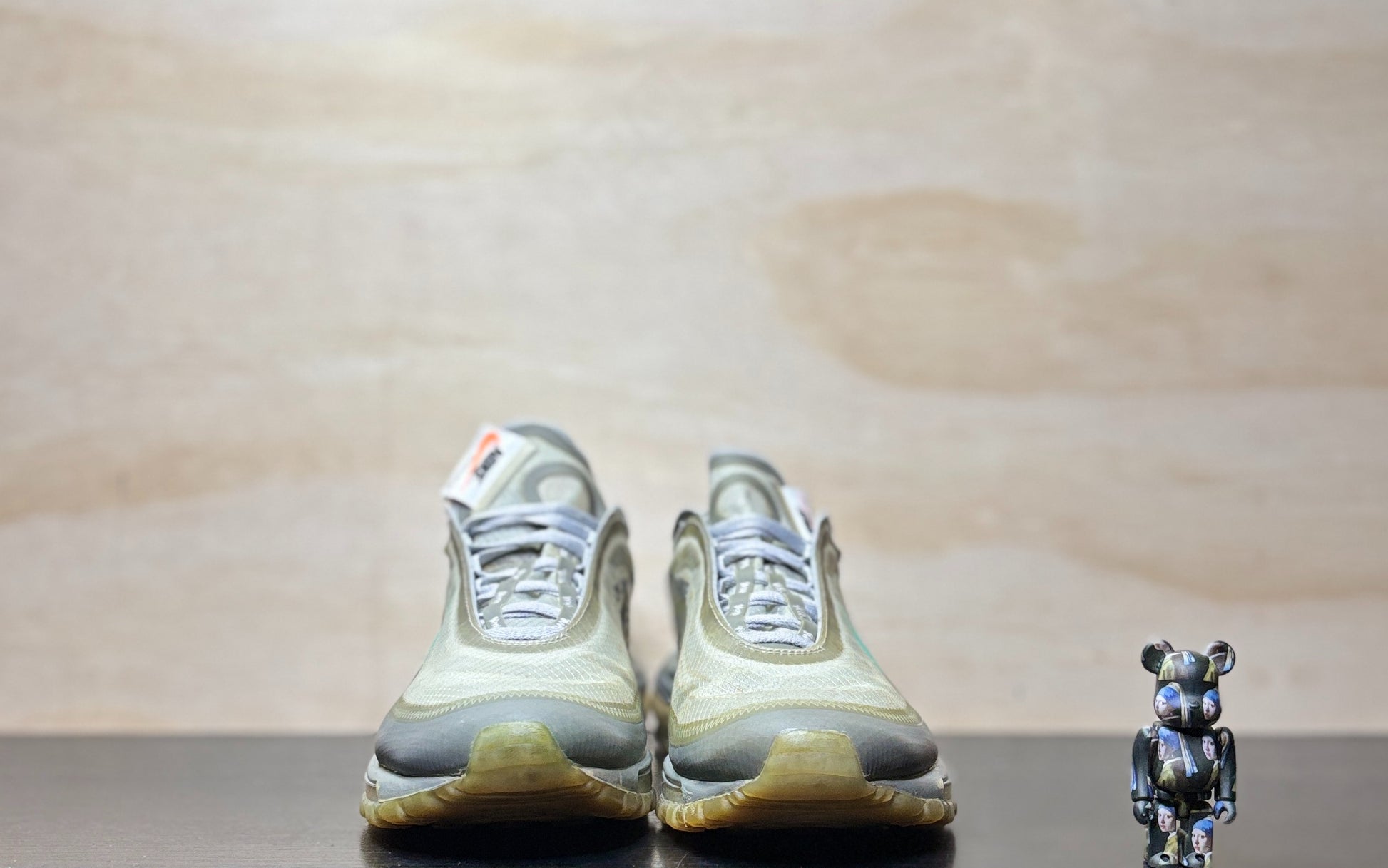 The Off-White x Air Max 97 ‘Menta’ features a translucent textile upper finished in Wolf Grey, complemented by Virgil Abloh’s signature text and tonal zigzag stitching throughout. The neutral color scheme is disrupted by a multicolored Swoosh that transitions from green to blue to red, while underfoot, a smoky grey rubber outsole maintains the shoe’s translucent theme.