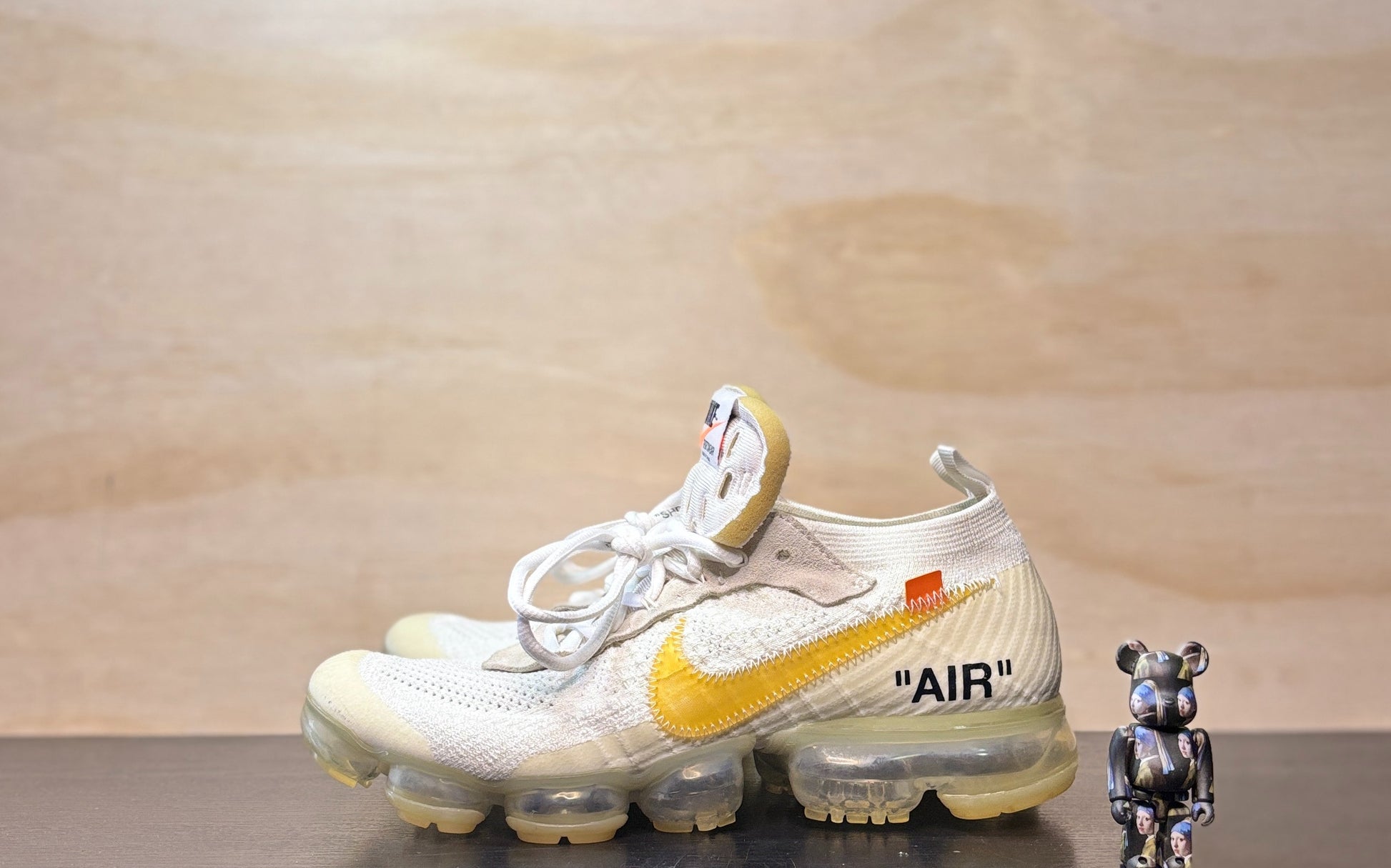 The April 2018 version of Virgil Abloh’s all-white Air VaporMax is mostly unchanged from the original pair from ‘The Ten.’ Stripped of color, the performance runner brings raw materials and unique details to the forefront, including an exposed-foam tongue, translucent Swoosh and Off-White suede eyestay. Printed above the clear VaporMax unit, the quotation ‘AIR’ print on the lateral side takes on an extra meta dimension.